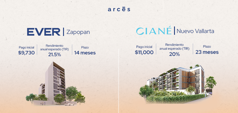 Arces es una plataforma de inversión en crowdfunding inmobiliario regulada por la CNBV, BANXICO y CONDUSEF con la que podrás invertir en fracciones de inmuebles premium en preventa, con la garantía de que estarán al mismo precio que si compraras directamente con el desarrollador el inmueble completo.